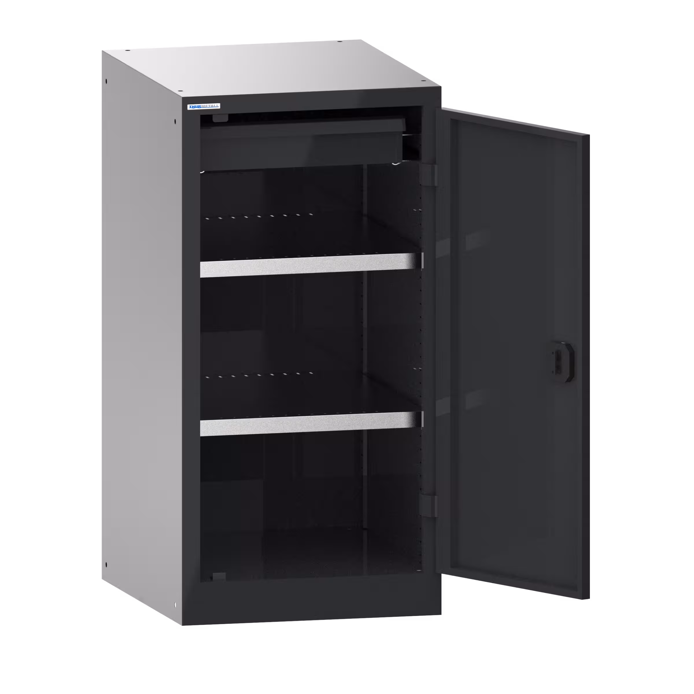 Flügeltürschränke: Die Schränke sind je nach Modell ausgestattet mit: Verstellböden verzinkt, 30 mm stark, Tragkraft 60 oder 100 kg. Auszugböden und Schubladen lackiert, Anthrazitgrau, RAL 7016, Tragkraft 50 kg.
