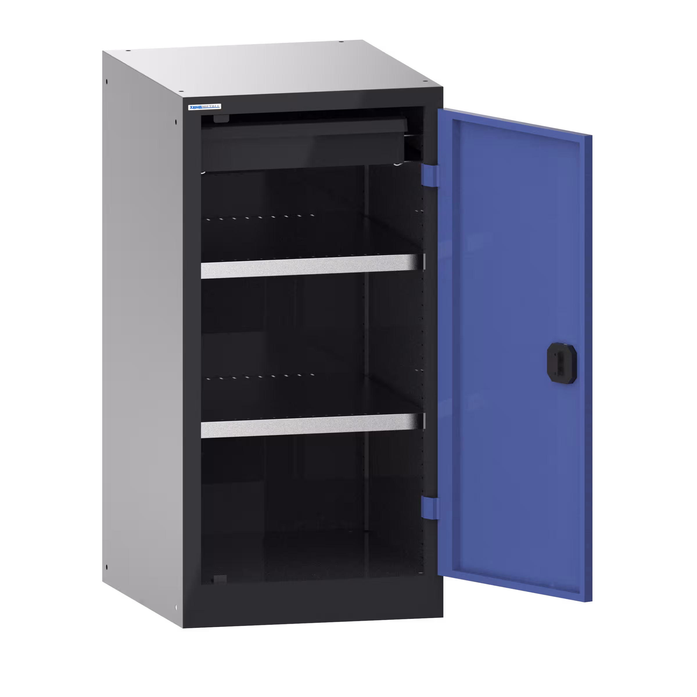 Flügeltürschränke: Die Schränke sind je nach Modell ausgestattet mit: Verstellböden verzinkt, 30 mm stark, Tragkraft 60 oder 100 kg. Auszugböden und Schubladen lackiert, Anthrazitgrau, RAL 7016, Tragkraft 50 kg.