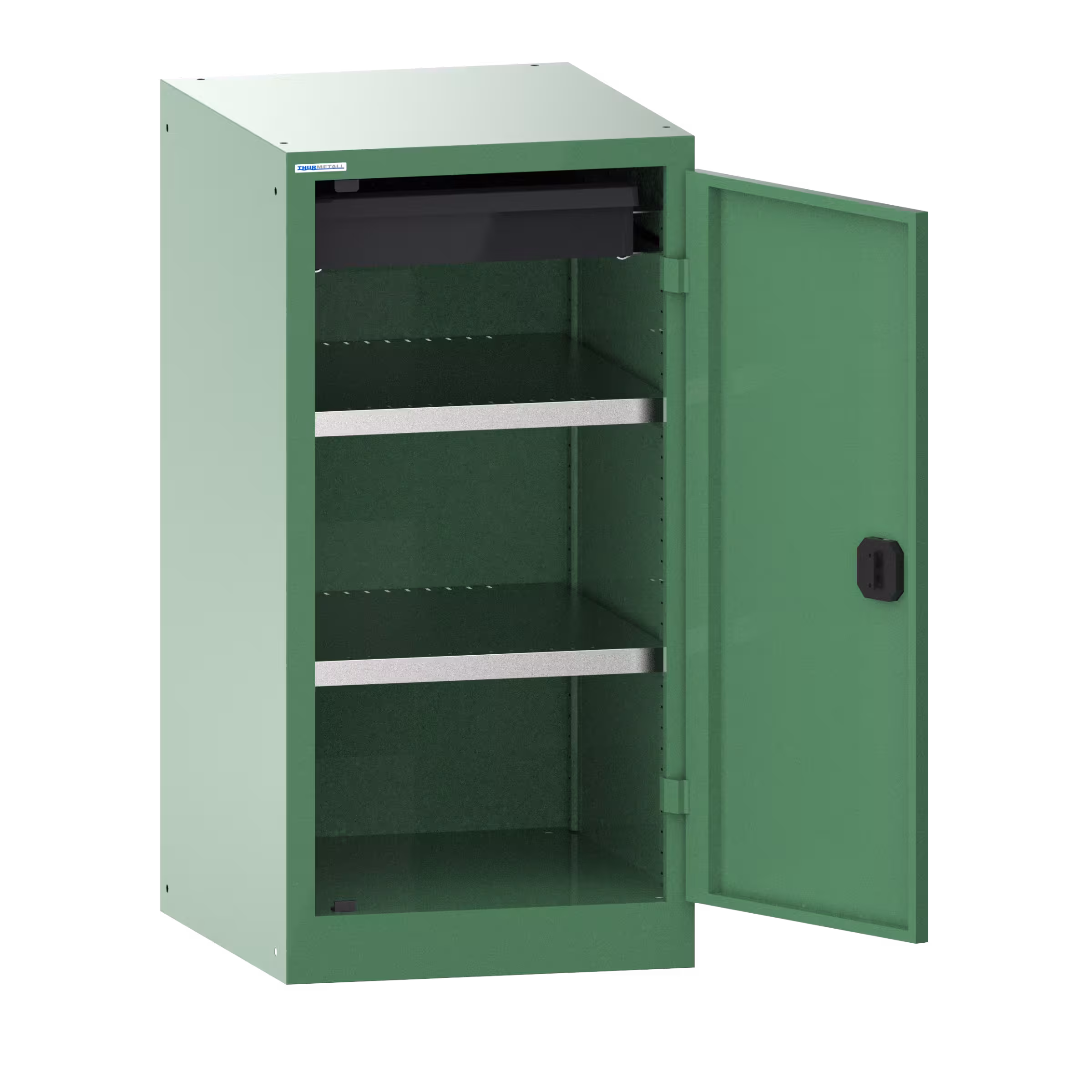 durch optionalen Einbau von Schubladen und Auszugböden für eine saubere und übersichtliche Lagerung von Kleinteilen (bei Schranktiefe 580 mm)