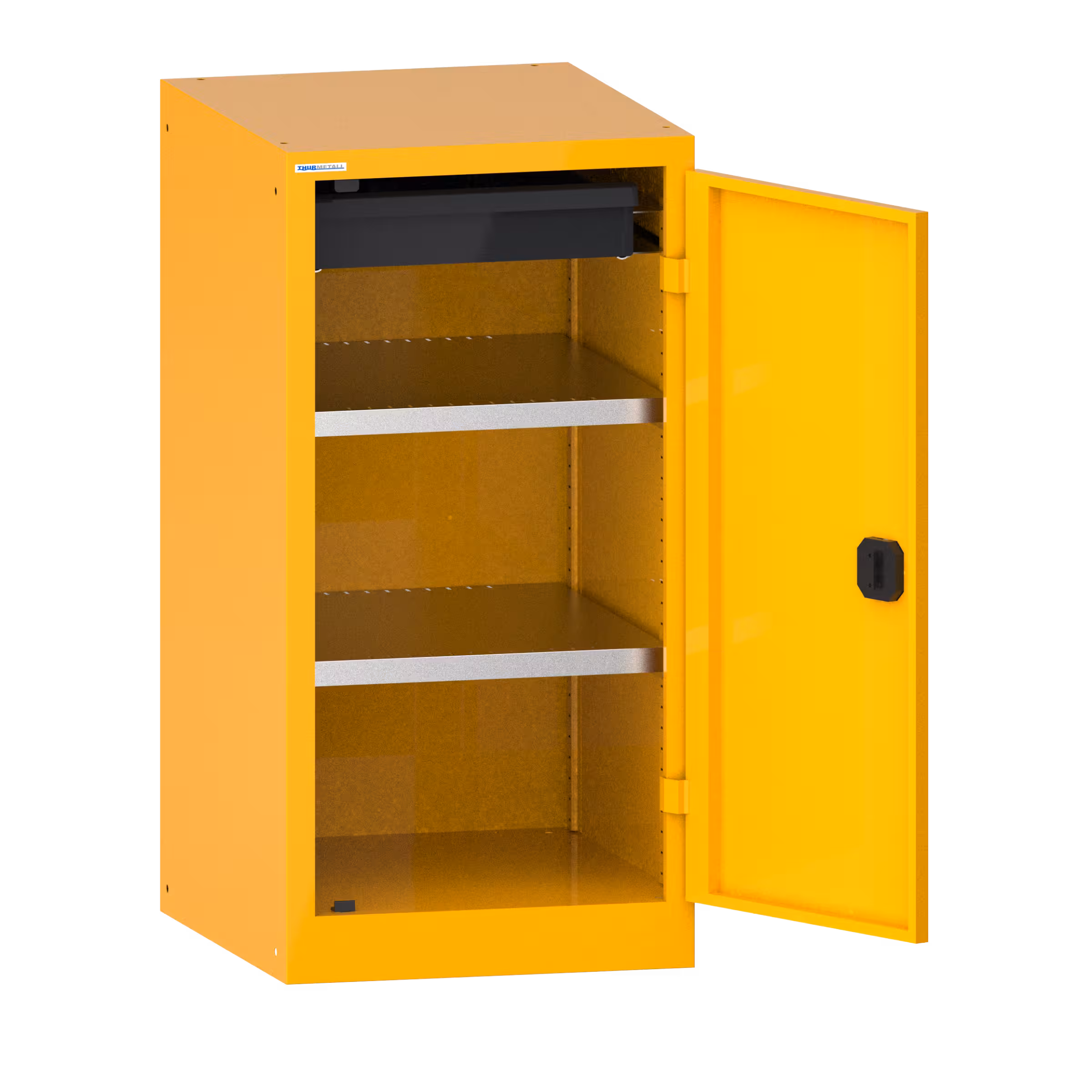 Flügeltürschränke: Die Schränke sind je nach Modell ausgestattet mit: Verstellböden verzinkt, 30 mm stark, Tragkraft 60 oder 100 kg. Auszugböden und Schubladen lackiert, Anthrazitgrau, RAL 7016, Tragkraft 50 kg.