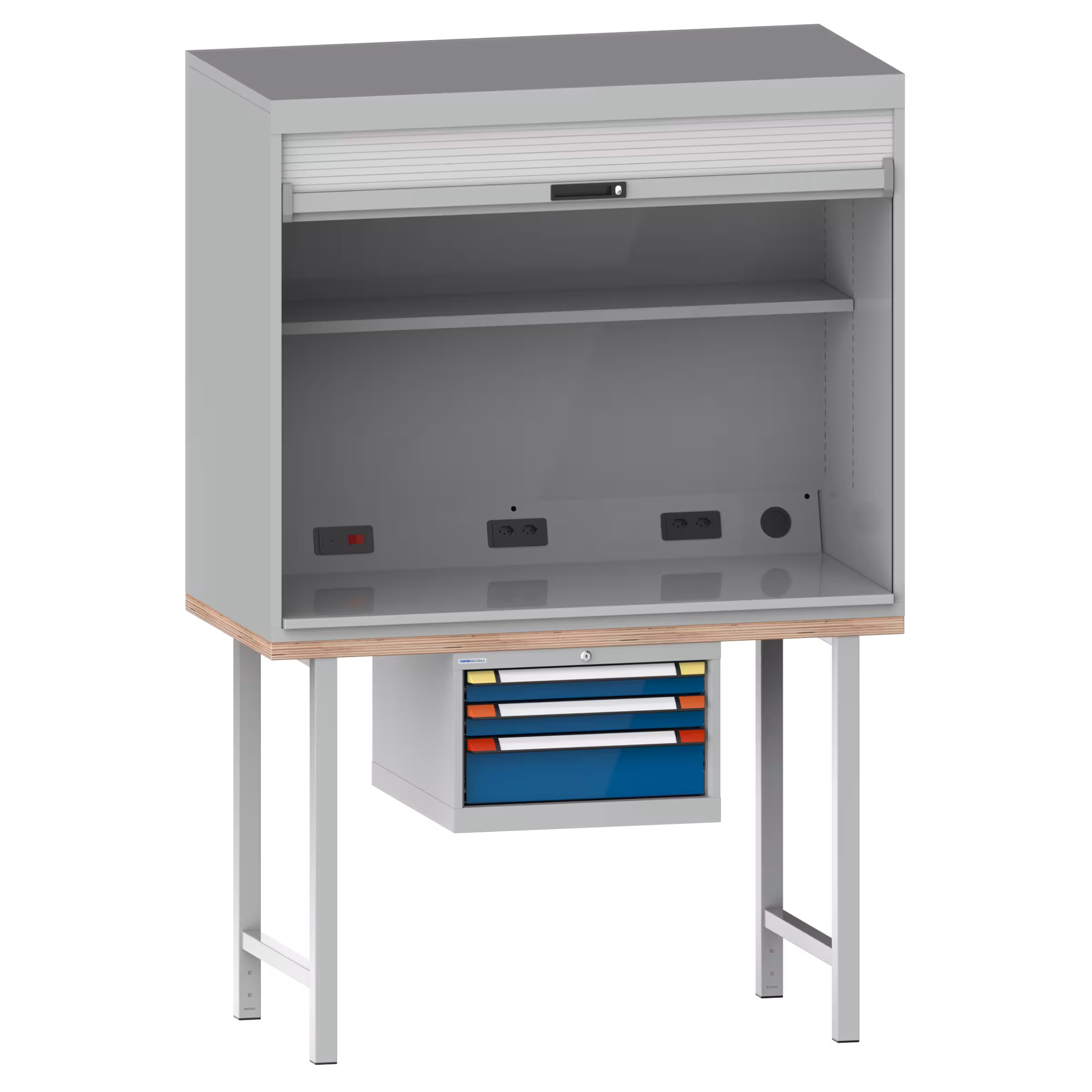 Quality Station (BxTxH) 1434x725x2140mm, 3 Schubladen (2x75/1x150mm) ,Typ DE/Schuko , KEY Lock, Lichtgrau RAL 7035 / Lichtblau RAL 5012