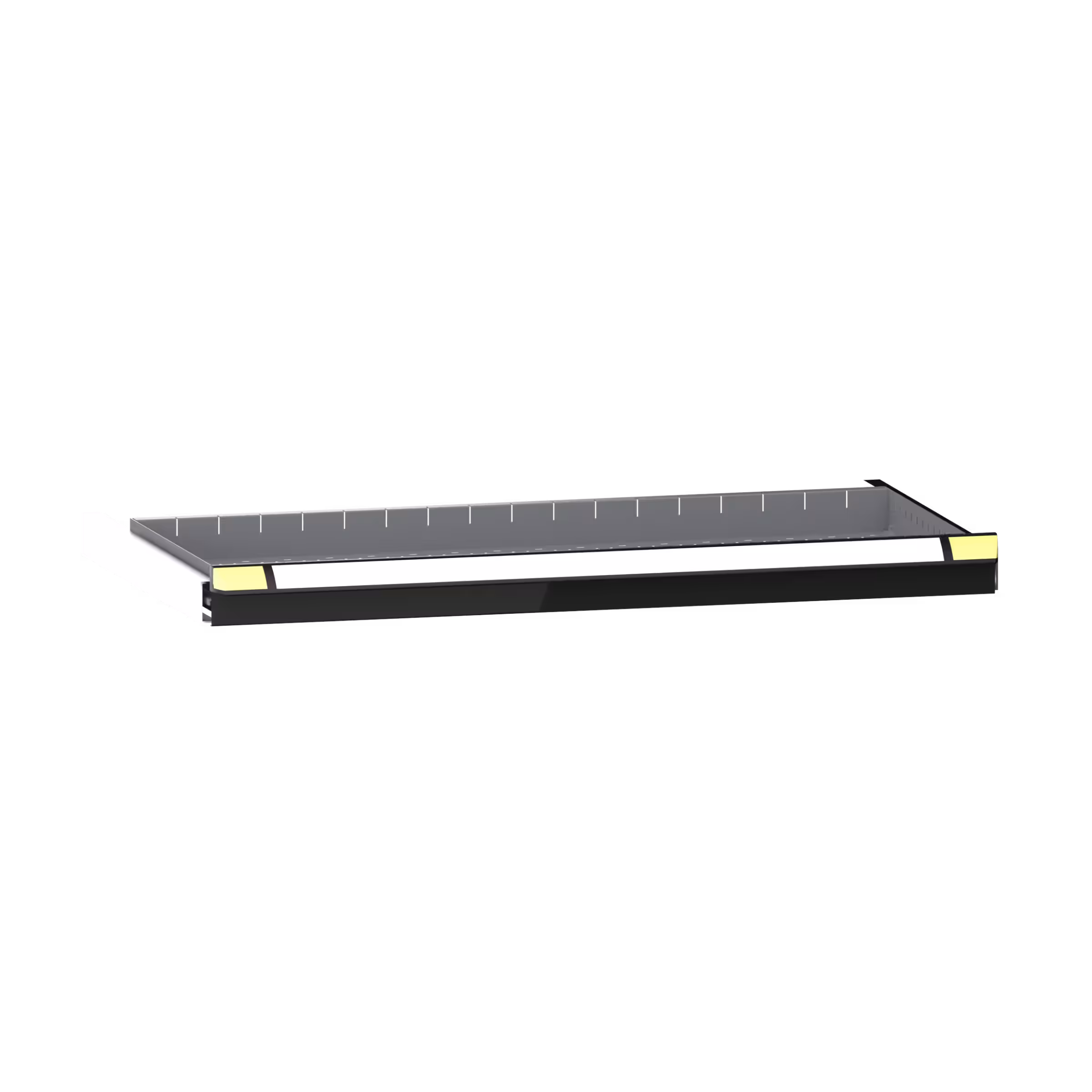 Schubladen: Vollauszug mit Kugellager, inklusive Führungsschienen. Die Schubladen-Wände sind innen allseitig mit einem Schlitzraster versehen. Die Fronten sind mit durchgehenden Griffleisten mit integrierten Etikettenleisten und Klarsichtabdeckungen versehen.