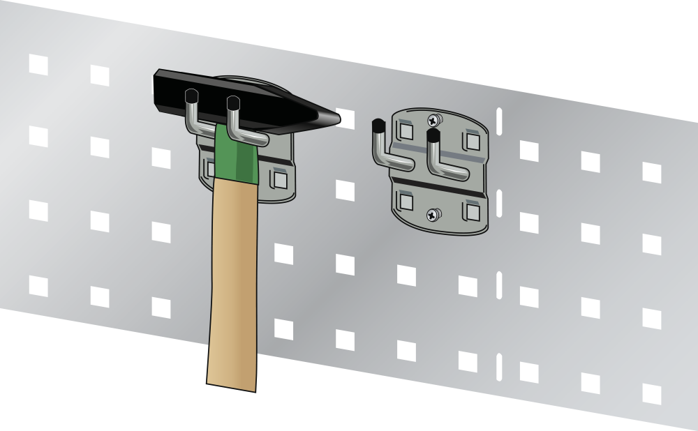 Die Lochplattenhaken sind mittels beiliegendem Befestigungsmaterial zu arretieren. Farbe der Halter: Weissaluminium, RAL 9006. Tragkraft pro Lochplattenhaken max. 5 kg.