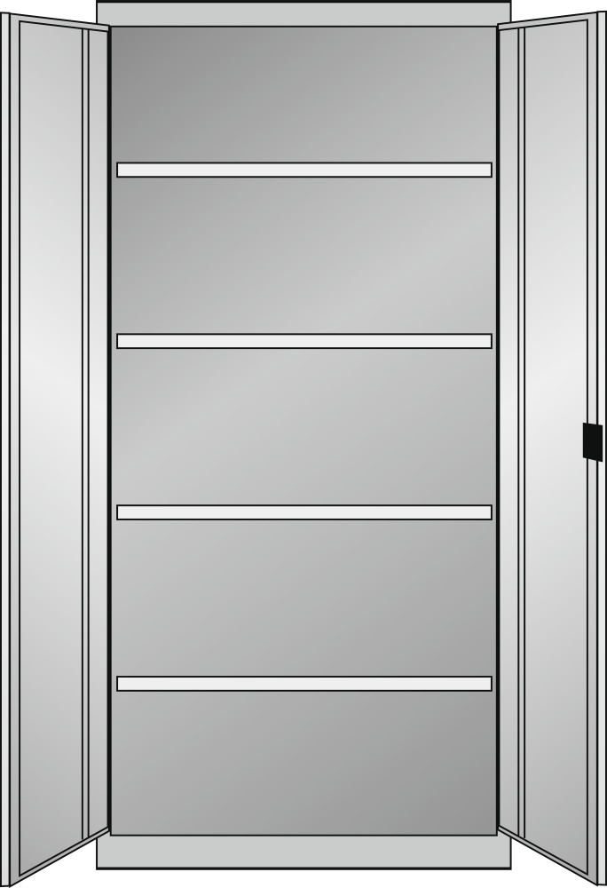 Hinged door cabinets: Depending on the model, the cabinets are equipped with: galvanised adjustable shelves, 30mm thick, load capacity 60 or 100kg. Pull-out shelves and drawers painted, anthracite grey, RAL 7016, load capacity 50kg.