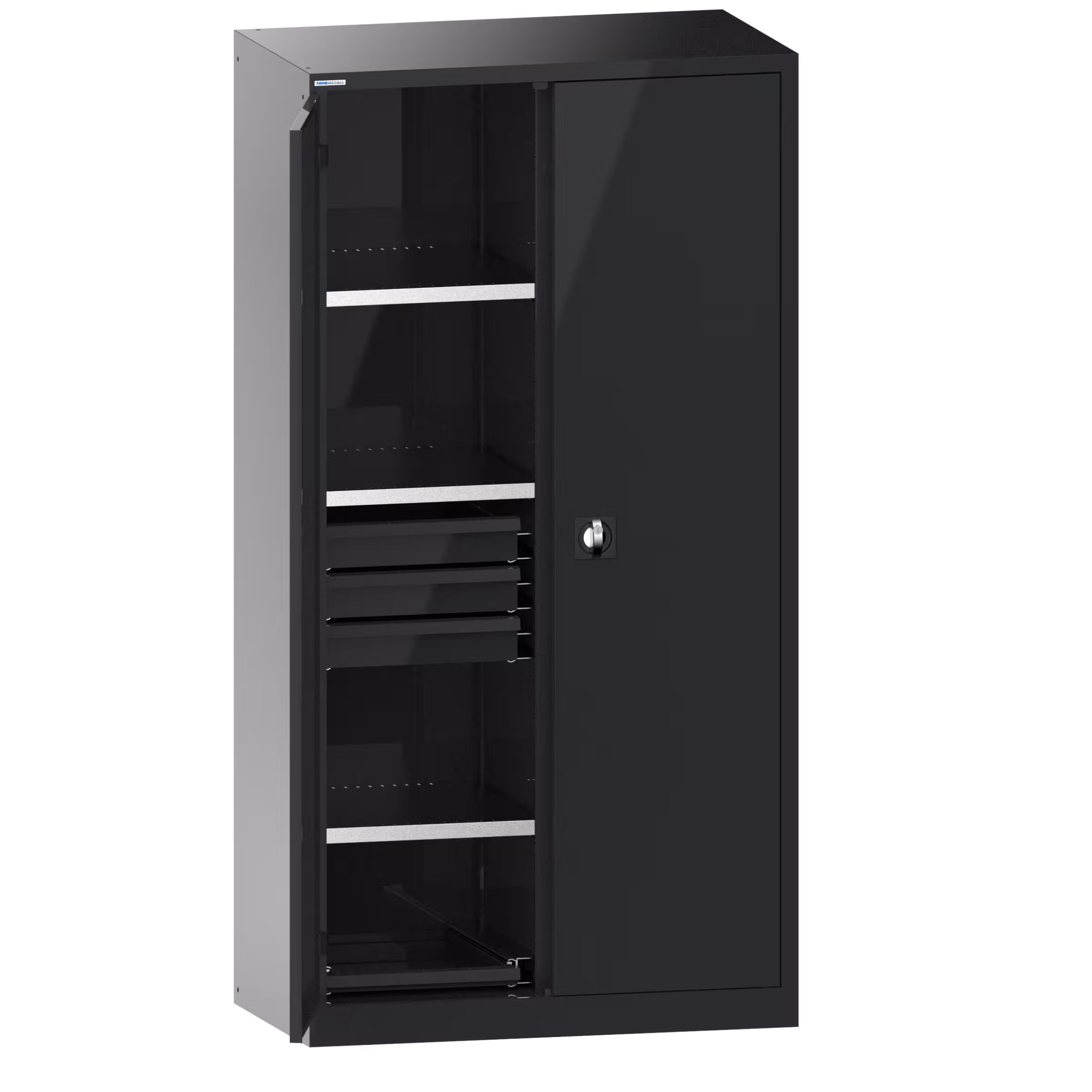 Hinged door cabinet with solid sheet doors und Divider (WxDxH) 1000x580x1950mm 6 shelves, 6 drawers, 2 pull-out shelves KEY Lock Anthracite grey RAL 7016