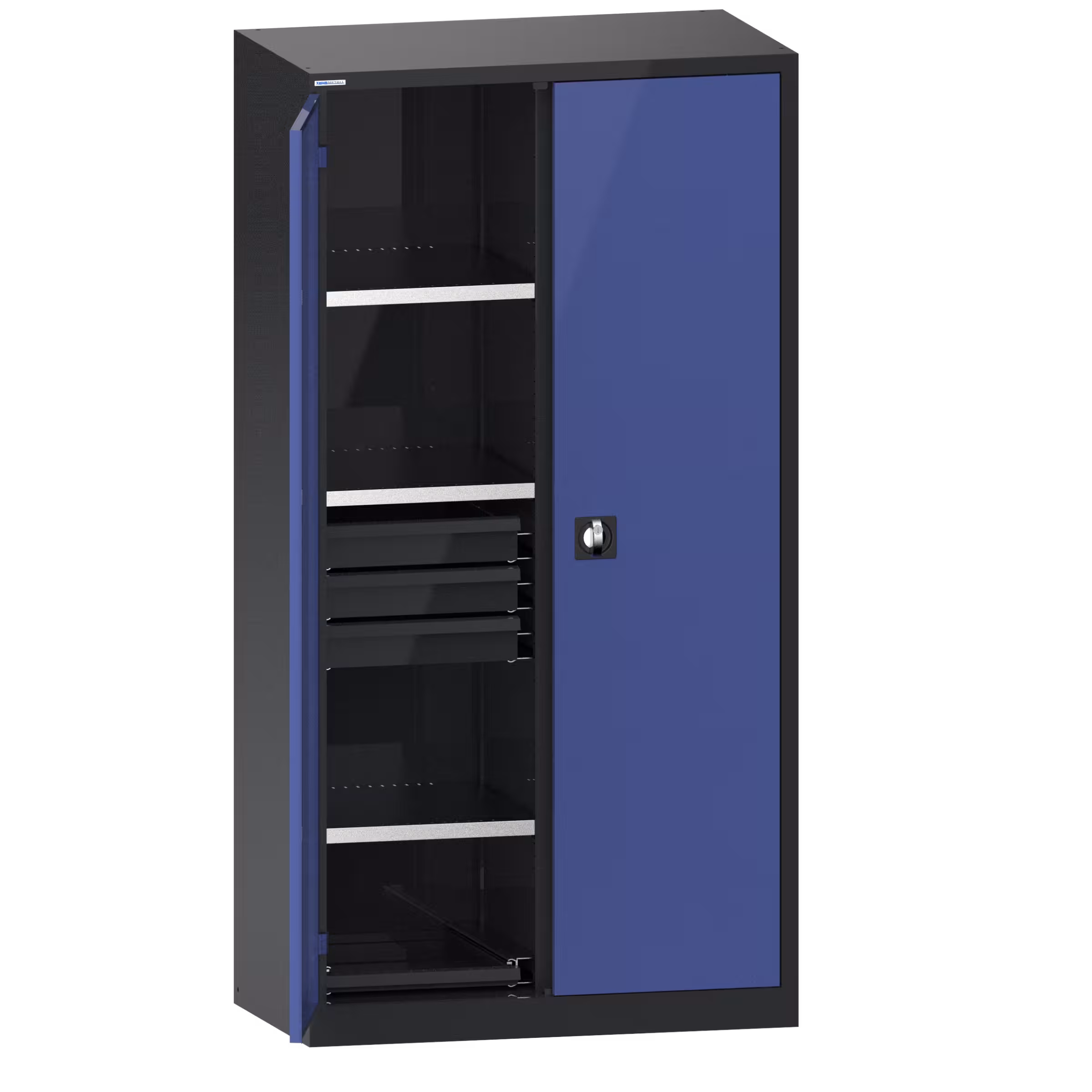 Hinged door cabinet with solid sheet doors und Divider (WxDxH) 1000x580x1950mm 6 shelves, 6 drawers, 2 pull-out shelves KEY Lock Anthracite grey RAL 7016 / Pigeon blue NCS S 4040-R70 B