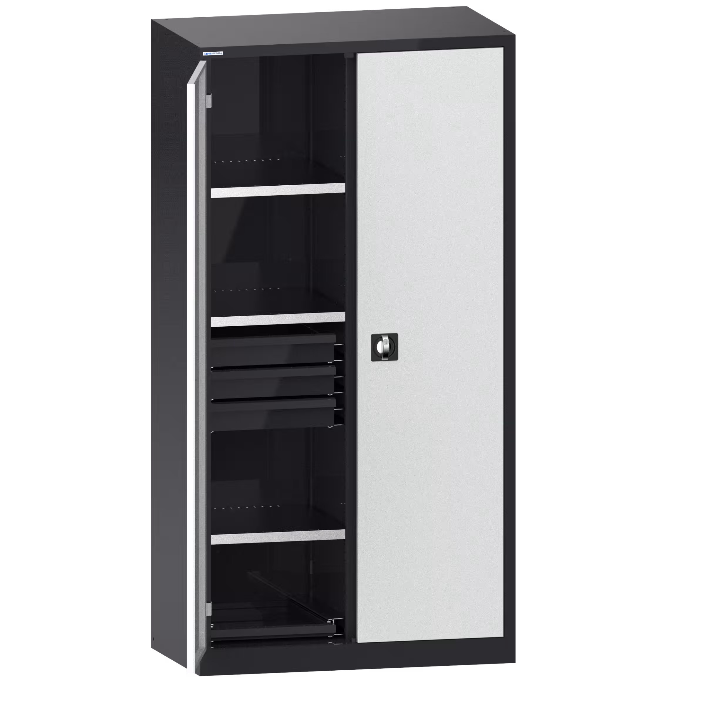 Hinged door cabinet with solid sheet doors und Divider (WxDxH) 1000x580x1950mm 6 shelves, 6 drawers, 2 pull-out shelves KEY Lock Anthracite grey RAL 7016 RAL 7016 / Light grey RAL 7035