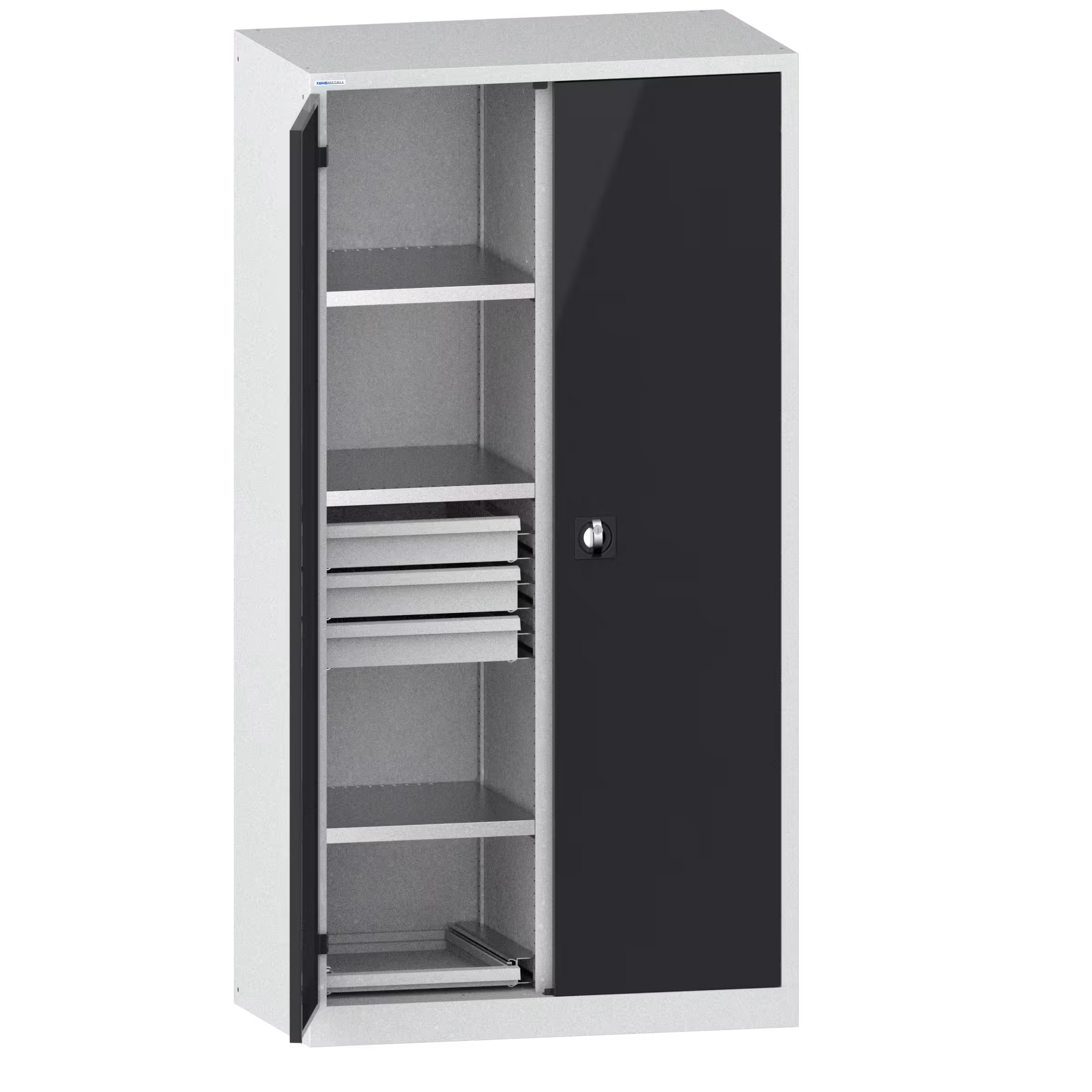 Hinged door cabinet with solid sheet doors und Divider (WxDxH) 1000x580x1950mm 6 shelves, 6 drawers, 2 pull-out shelves KEY Lock Light grey RAL 7035 / Anthracite grey RAL 7016