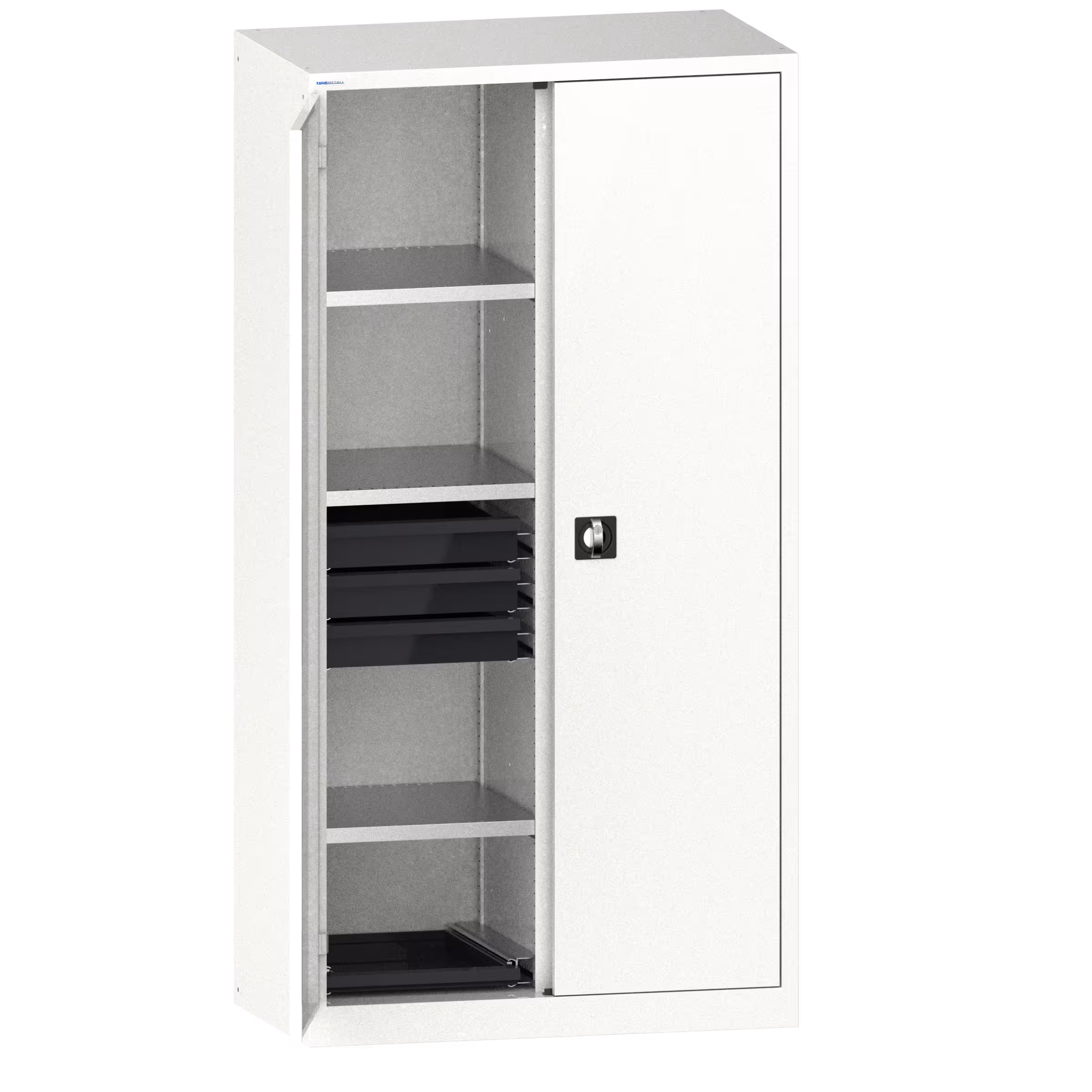 Hinged door cabinet with solid sheet doors und Divider (WxDxH) 1000x580x1950mm 6 shelves, 6 drawers, 2 pull-out shelves KEY Lock Pure white RAL 9010