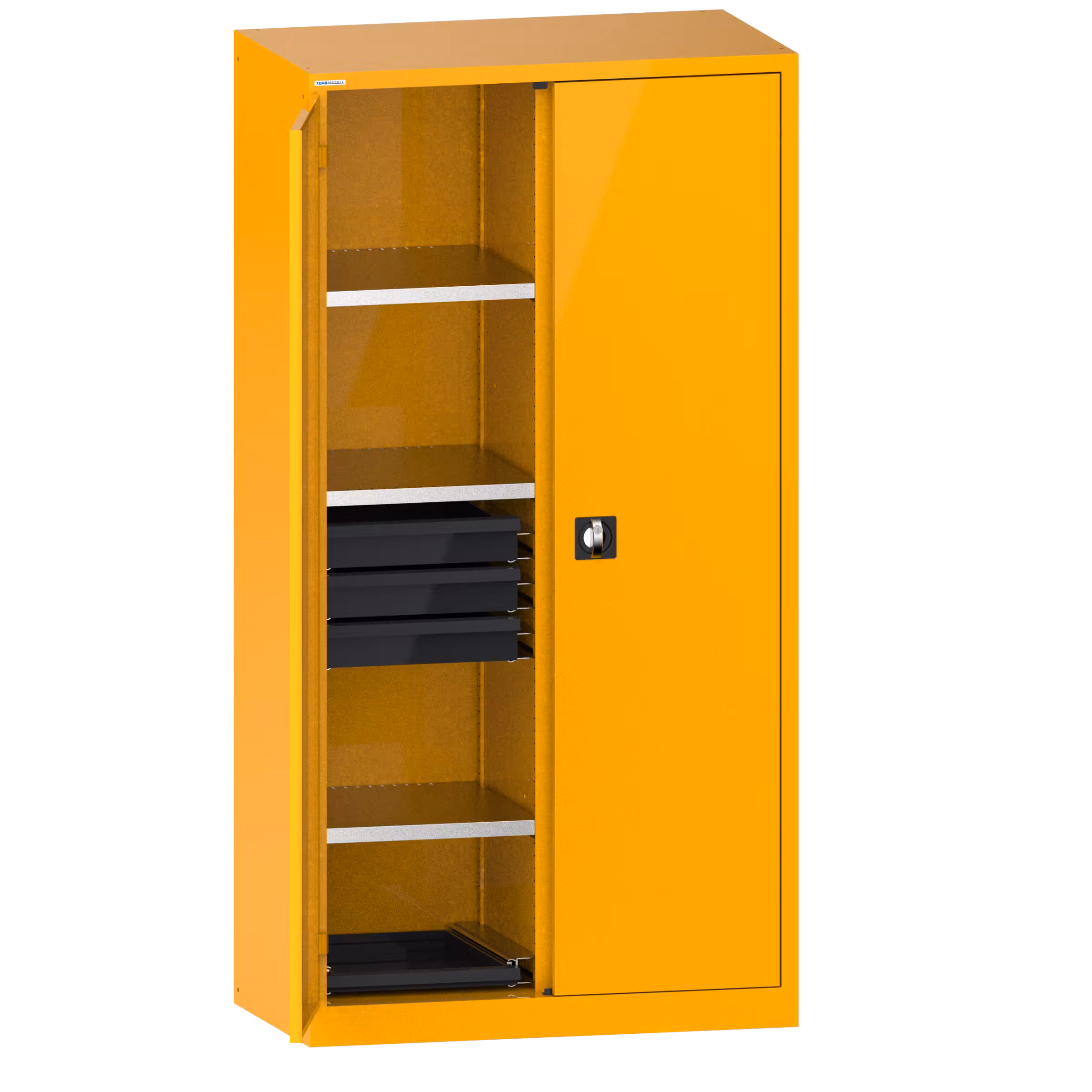 Hinged door cabinet with solid sheet doors und Divider (WxDxH) 1000x580x1950mm 6 shelves, 6 drawers, 2 pull-out shelves KEY Lock Traffic yellow RAL 1023