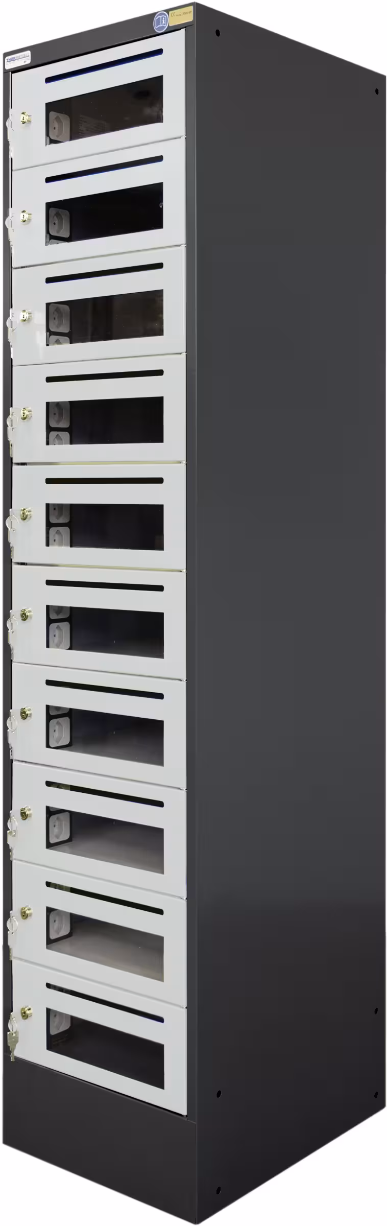 Laptop cabinet with viewing window door (WxDxH) 415x500x1790mm 1x10 compartments Type DE / AT / NL 1x230V,1xUSB-CKEY Lock Anthracite grey RAL 7016 RAL 7016 / Light grey RAL 7035