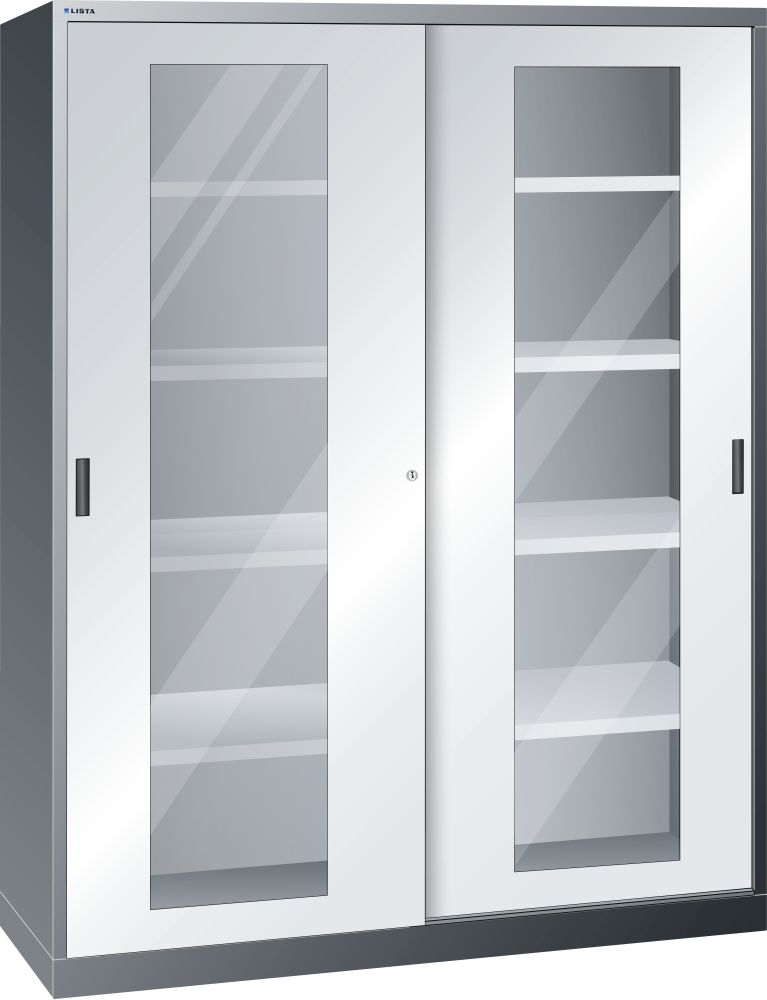 Sliding-door cabinets: Depending on the model, the cabinets are equipped with: galvanised adjustable shelves, 30 mm thick, load capacity 60 kg. Pull-out shelves and drawers painted, anthracite grey, RAL 7016, load capacity 50 kg
