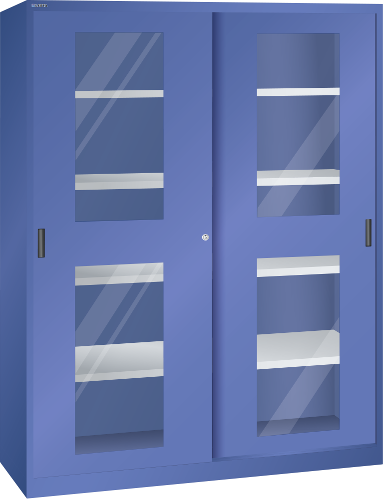 Sliding-door cabinet with 2 viewing window doors and partition (WxDxH) 1500x500x1950mm 8 shelves KEY Lock Brilliant blue RAL 5007