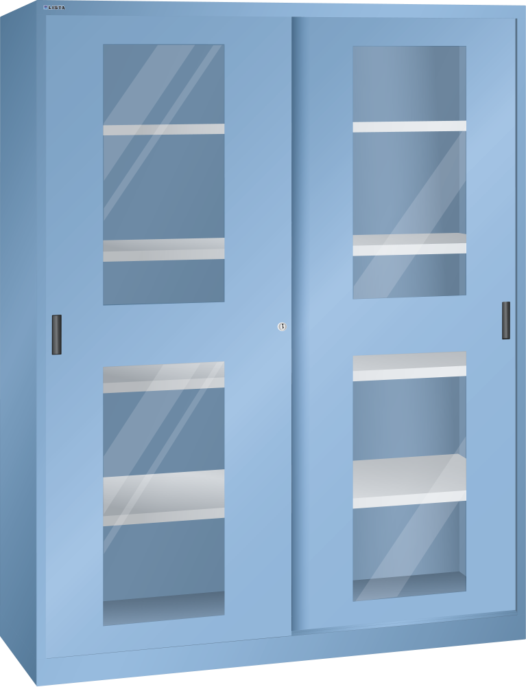 Sliding-door cabinet with 2 viewing window doors and partition (WxDxH) 1500x500x1950mm 8 shelves KEY Lock Light blue RAL 5012