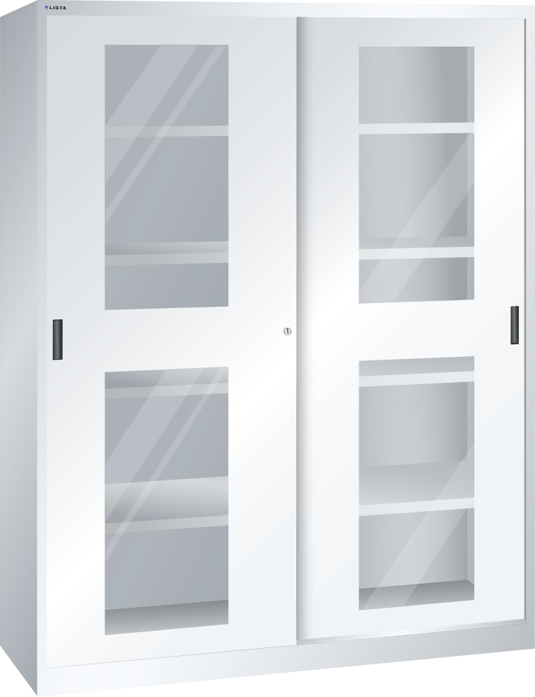 Sliding-door cabinet with 2 viewing window doors and partition (WxDxH) 1500x500x1950mm 8 shelves KEY Lock Pure white RAL 9010