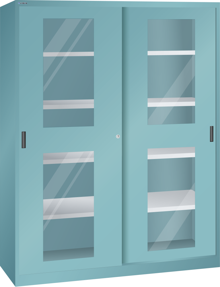 Sliding-door cabinet with 2 viewing window doors and partition (WxDxH) 1500x500x1950mm 8 shelves KEY Lock Turquoise blue RAL 5018