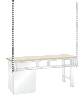 Support pillar for mounting on workbench substructure/Quattro/Duo/Solo: The support pillars are available in five heights. Capacity 150 kg. For mounting purposes, a guide rail pair is required. Including pillar bracket and fastening material. Specification: steel profile, perforated on four sides in increments of 50 mm for attaching the superstructure components with minimum use of screws. For double workstations, the same support pillars are used for both sides. Colour: according to colour chart.
