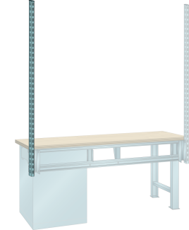 Support pillar for mounting on workbench substructure/Quattro/Duo/Solo: The support pillars are available in five heights. Capacity 150 kg. For mounting purposes, a guide rail pair is required. Including pillar bracket and fastening material. Specification: steel profile, perforated on four sides in increments of 50 mm for attaching the superstructure components with minimum use of screws. For double workstations, the same support pillars are used for both sides. Colour: according to colour chart.